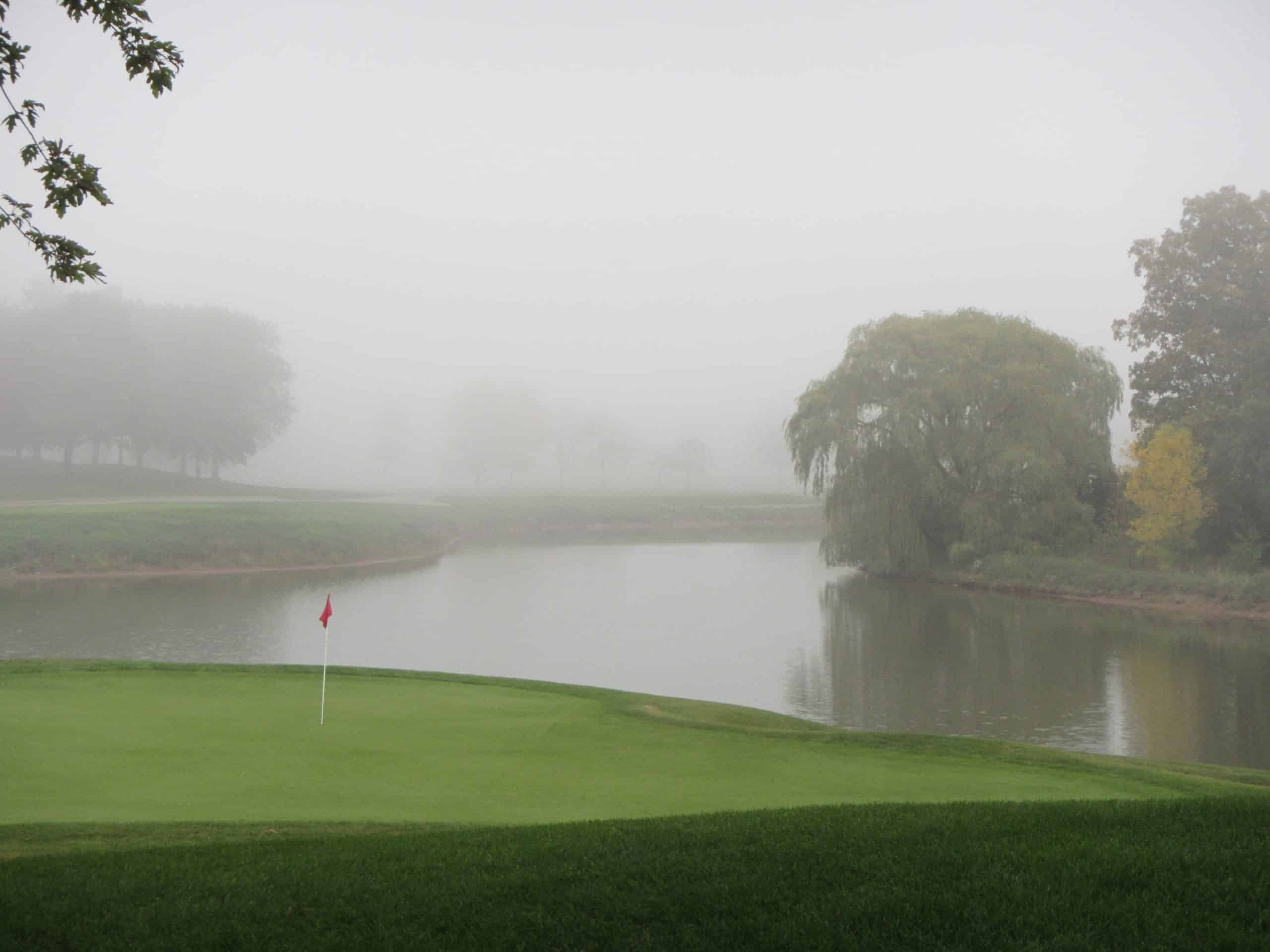 Driving down to Toronto from Ottawa, we had a bit of a detour as there was a large accident on the 401 which closed both lanes Westbound. With a detour across Ottawa in rush hour, we reached Glen Abbey around 1:30 for our 2:12 tee time. Starting out on the back nine, the 10th hole was the warm-up for the 11th which is a spectacular downhill par-4 with the green over water. I had a great drive over the tree, setting up a wedge to the green, which I managed to pull left into the green side bunker (the first green side bunker and not the last…). It was the first two holes of a tough back nine, finishing up with a smooth 51 which I followed up with a 48 on the front for 99 (managed to keep it under 100). The fog started to roll in, and the closing holes were increasingly hard to play as visibility dropped to about 100 yards.